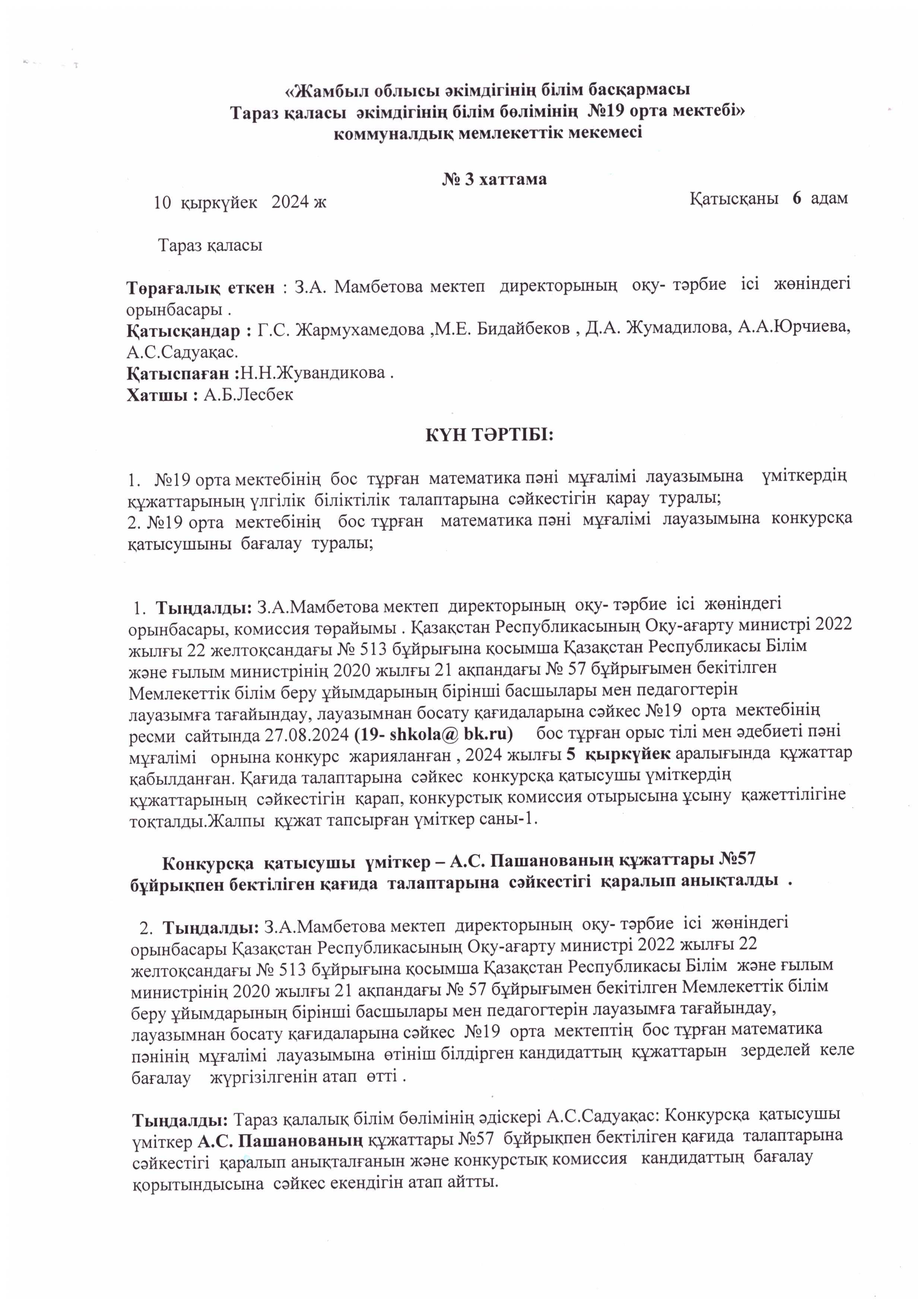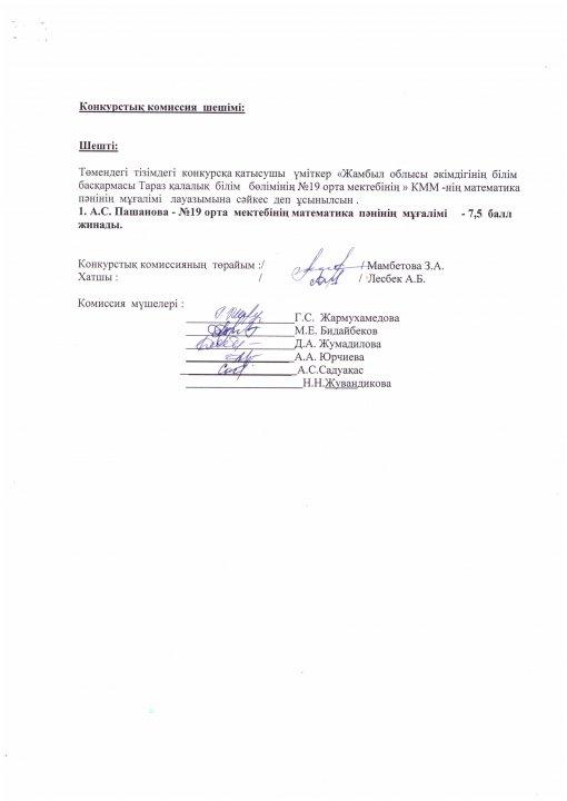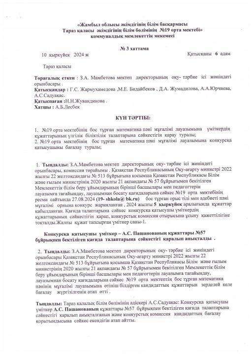 Педагог лауазымына қабылдау конкурсының хаттамасы » СШ №19