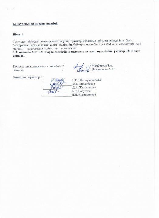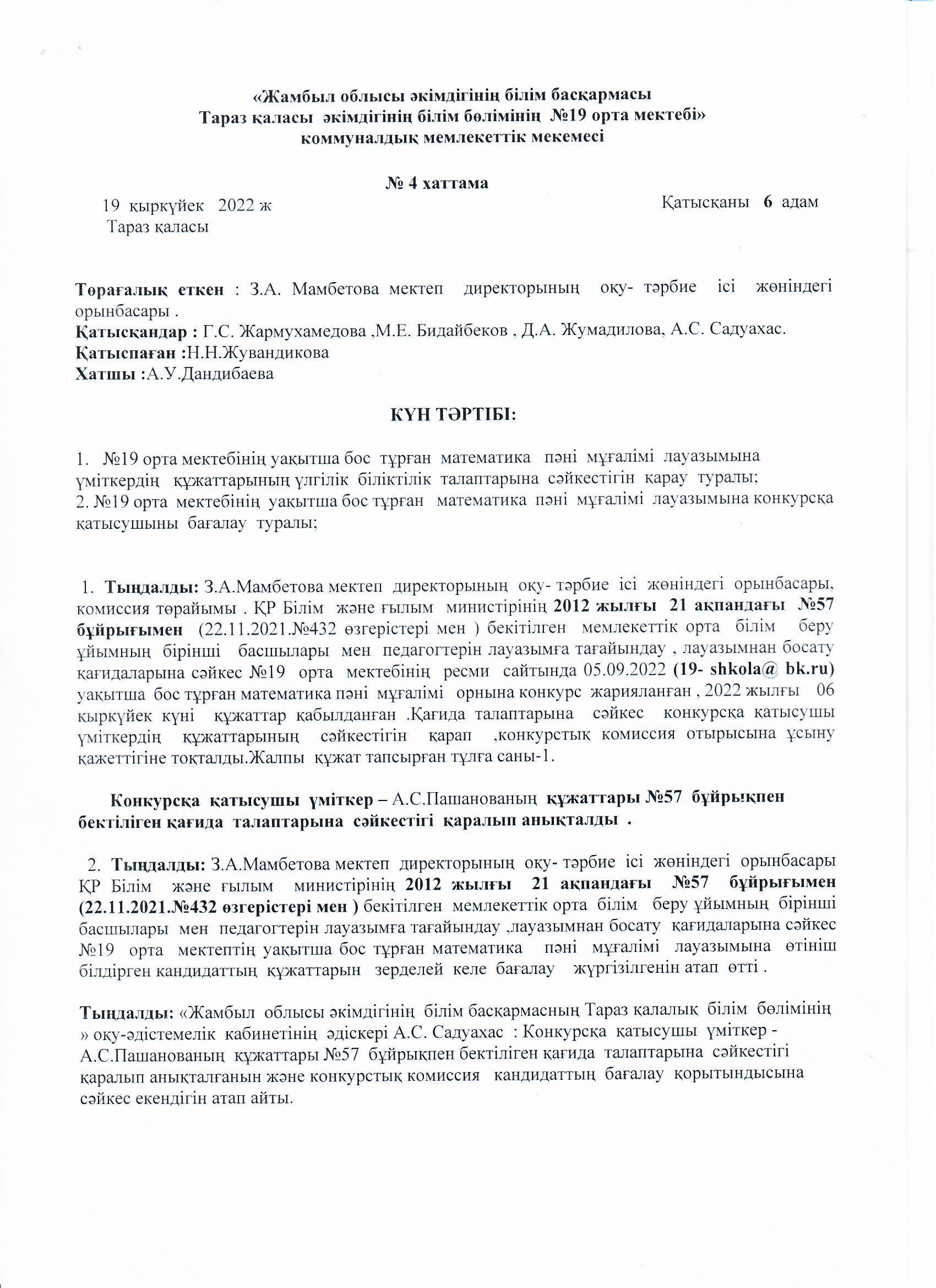 Педагог лауазымына қабылдау конкурсының хаттамасы » СШ №19