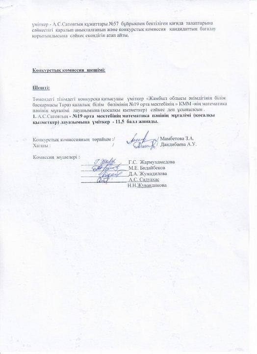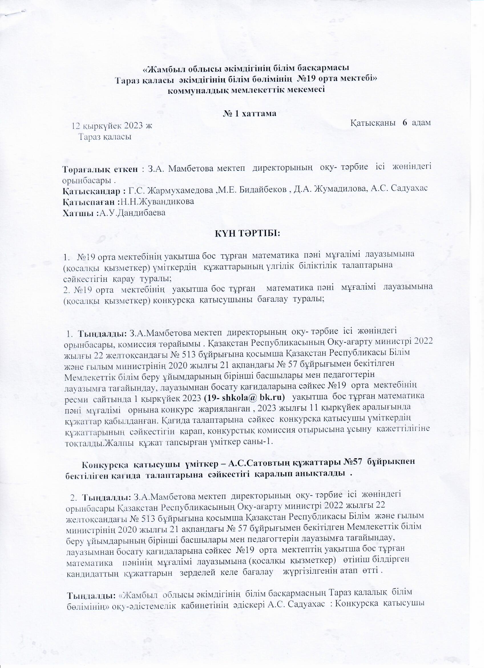 Педагог лауазымына қабылдау конкурсының хаттамасы » СШ №19