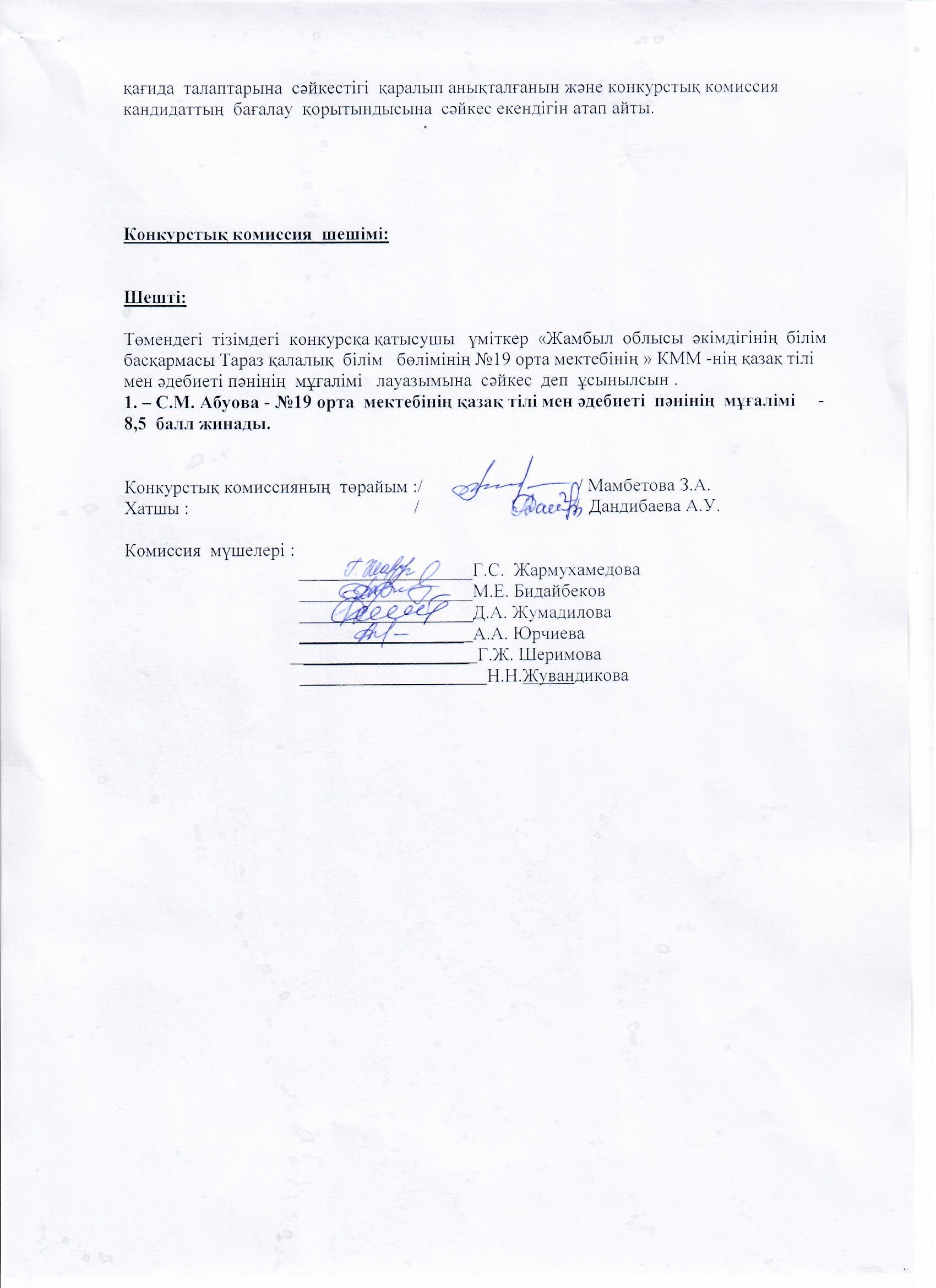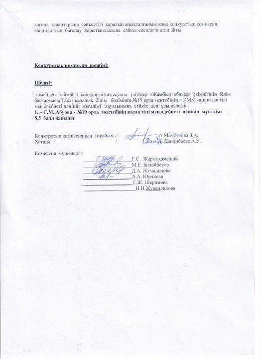 Педагог лауазымына қабылдау конкурсының хаттамасы » СШ №19