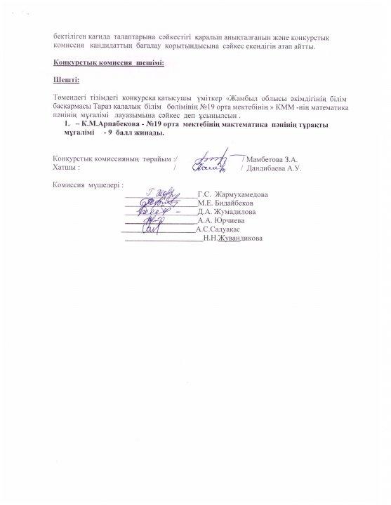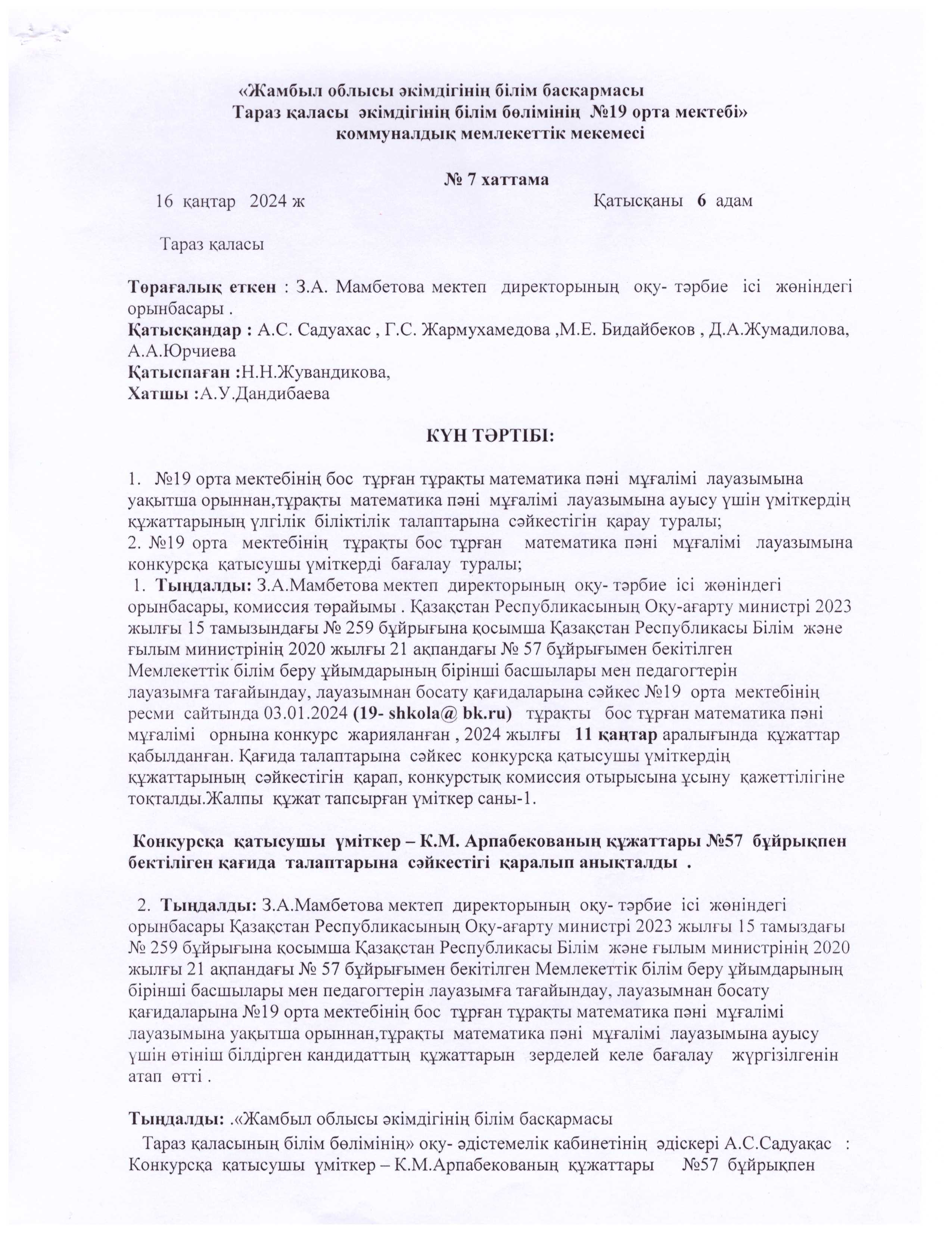 Педагог лауазымына қабылдау конкурсының хаттамасы » СШ №19