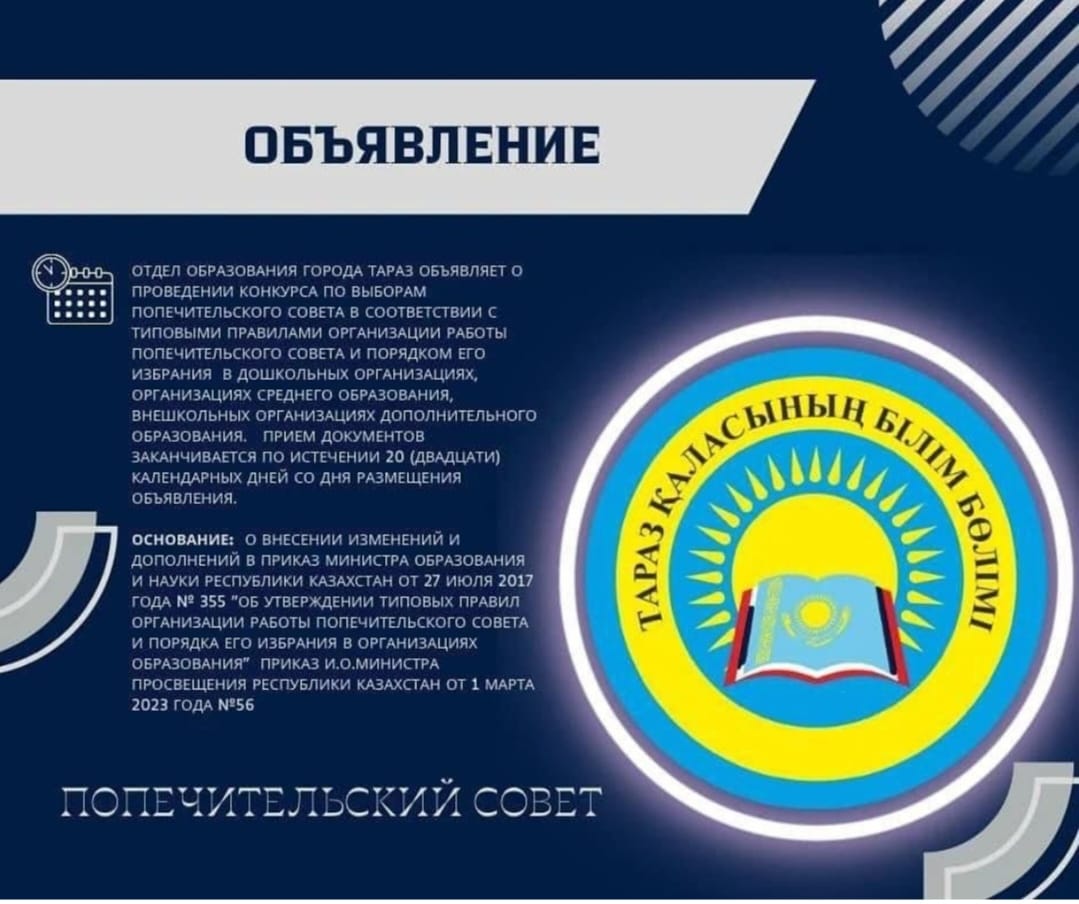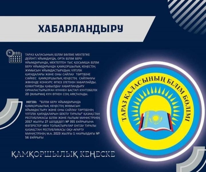 🔹Білім беру ұйымдарында қамқоршылық кеңестің жұмысын ұйымдастырудың үлгілік қағидалары және оны сайлау тәртібіне сәйкес Қамқоршылық кеңестің сайлануы жөнінде конкурс өткізілетінін хабарлаймыз. Құжаттарды қабылдау хабарландыру орналастырылған күннен бастап күнтізбелік 20 (жиырма) күн өткен соң аяқталады.