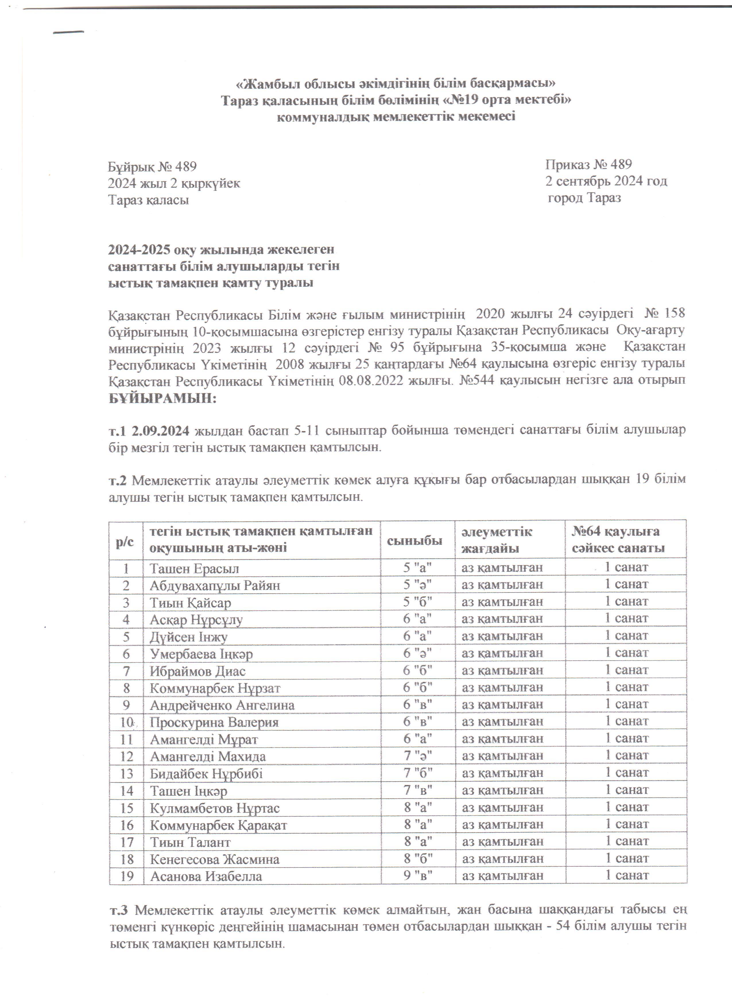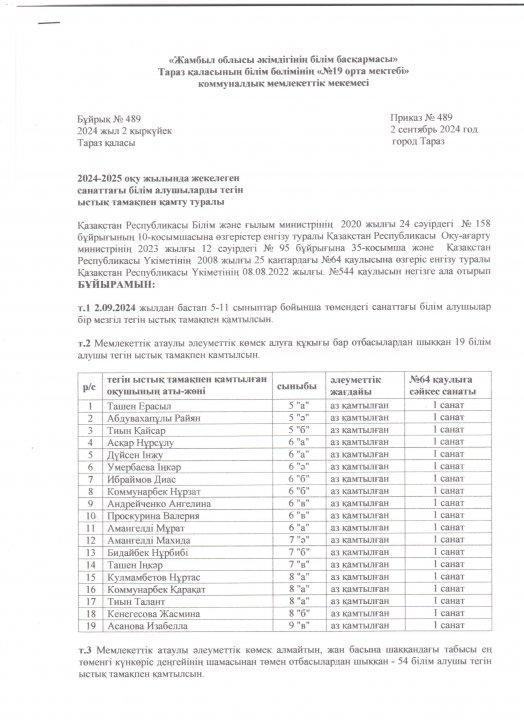 2024-2025 оқу жылында жекелеген санаттағы білім алушыларды тегін ыстық тамақпен қамту туралы №489 бұйрық 2.09.2024 ж. » СШ №19