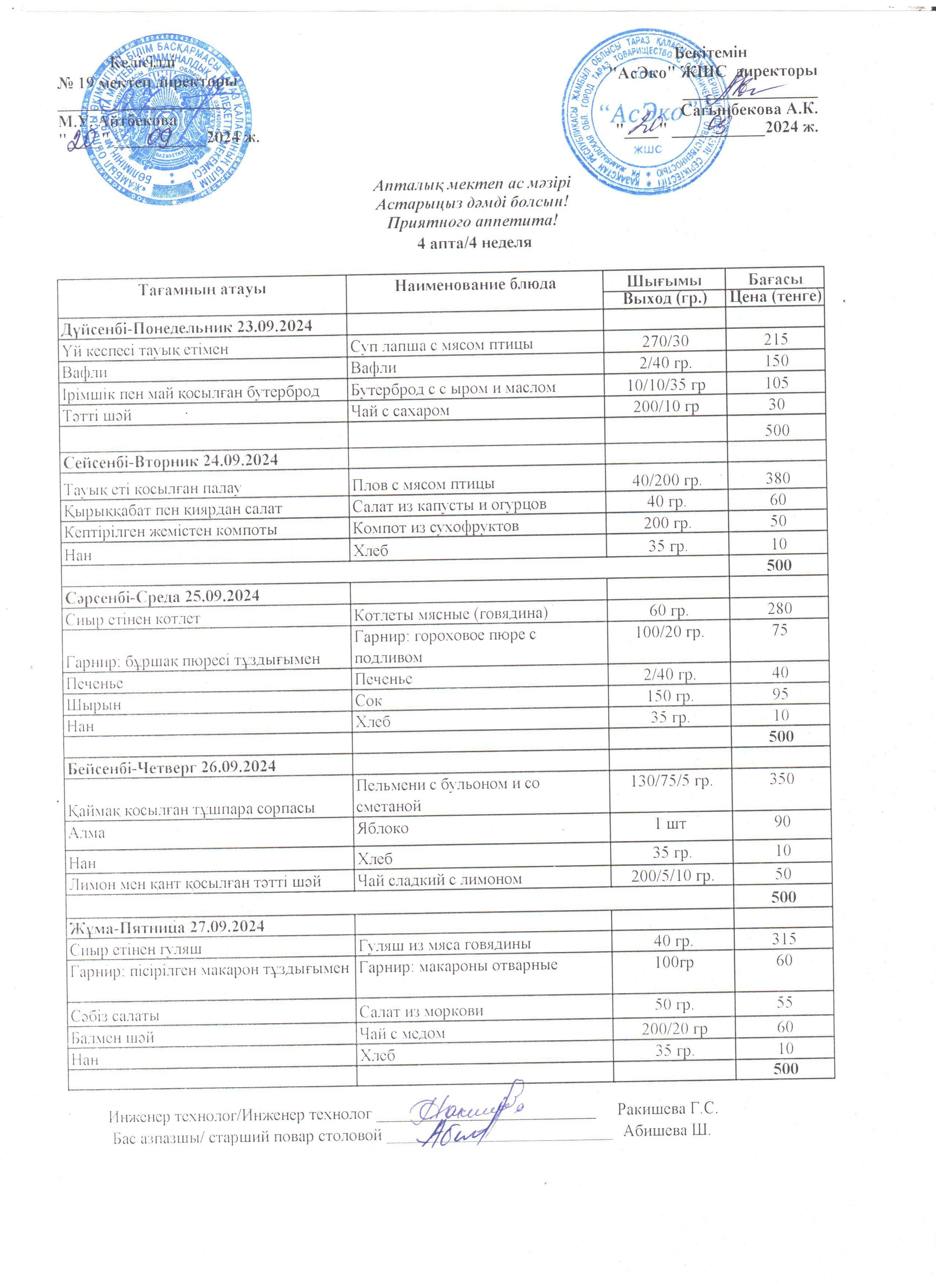 Апталық мектеп ас мәзірі (23.09-27.09.2024 ж.) » СШ №19