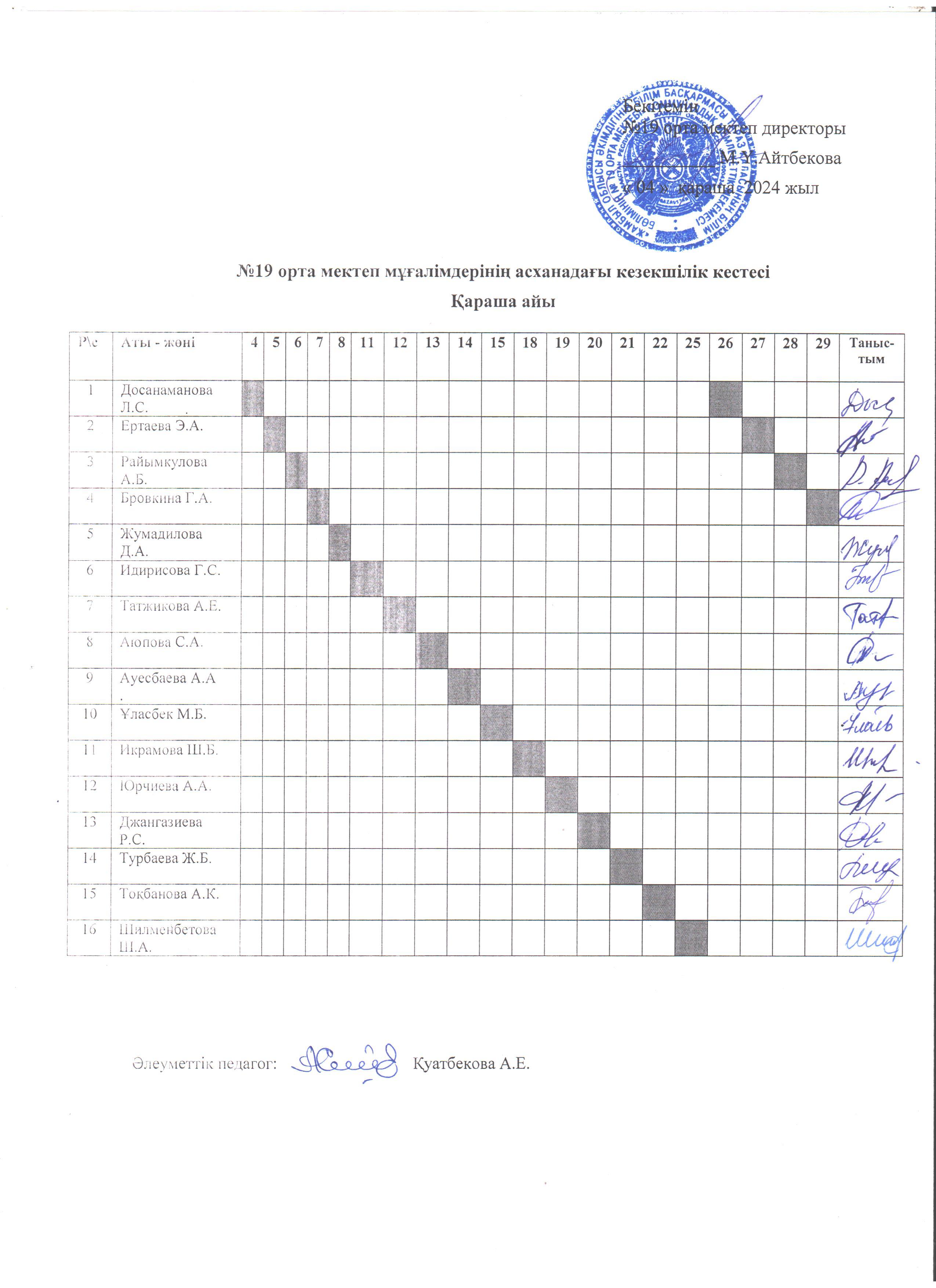 №19 орта мектеп мұғалімдерінің асханадағы кезекшілік кестесі (қараша айы)