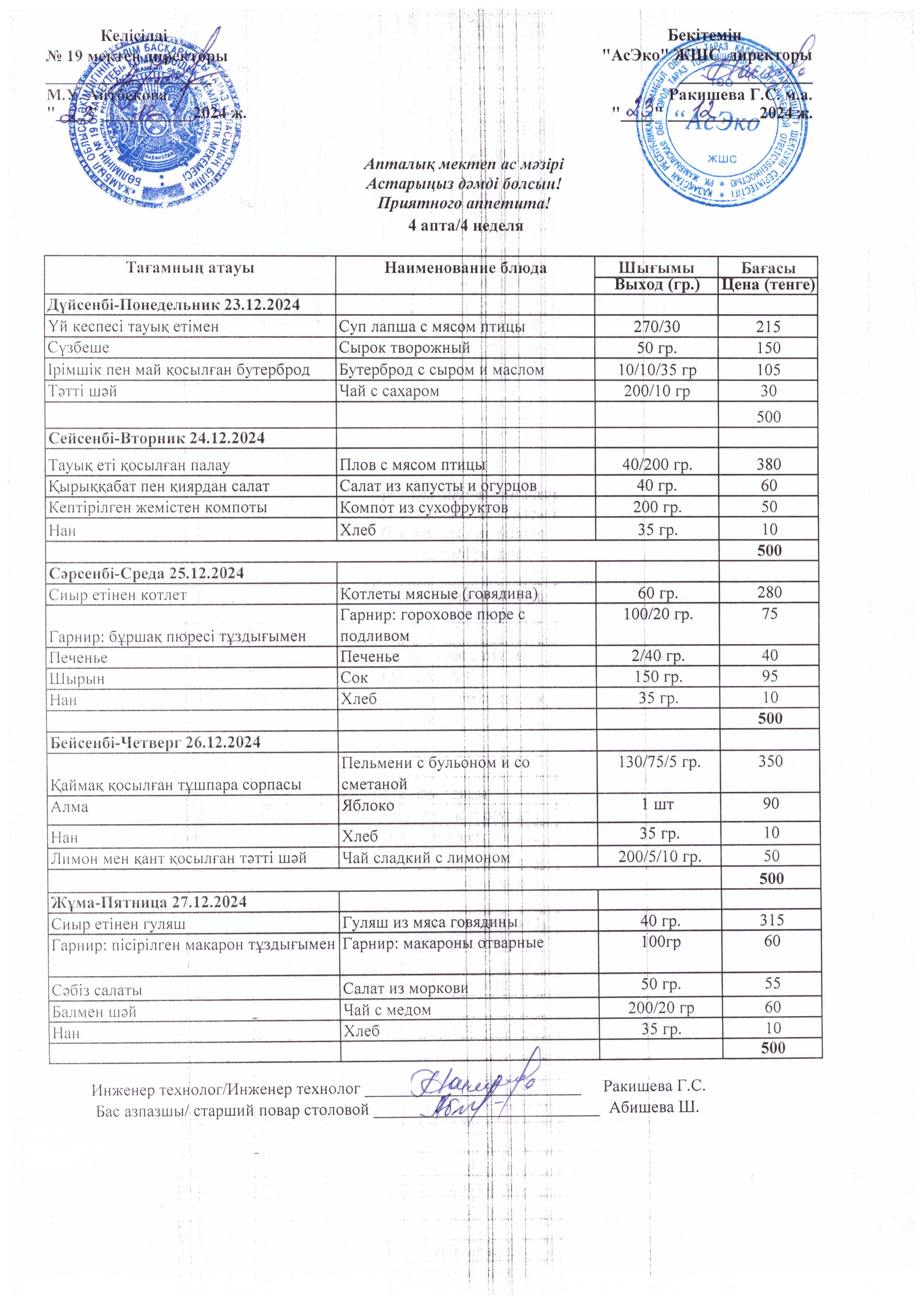 Апталық мектеп ас мәзірі (23-27.12.2024 ж.) » СШ №19