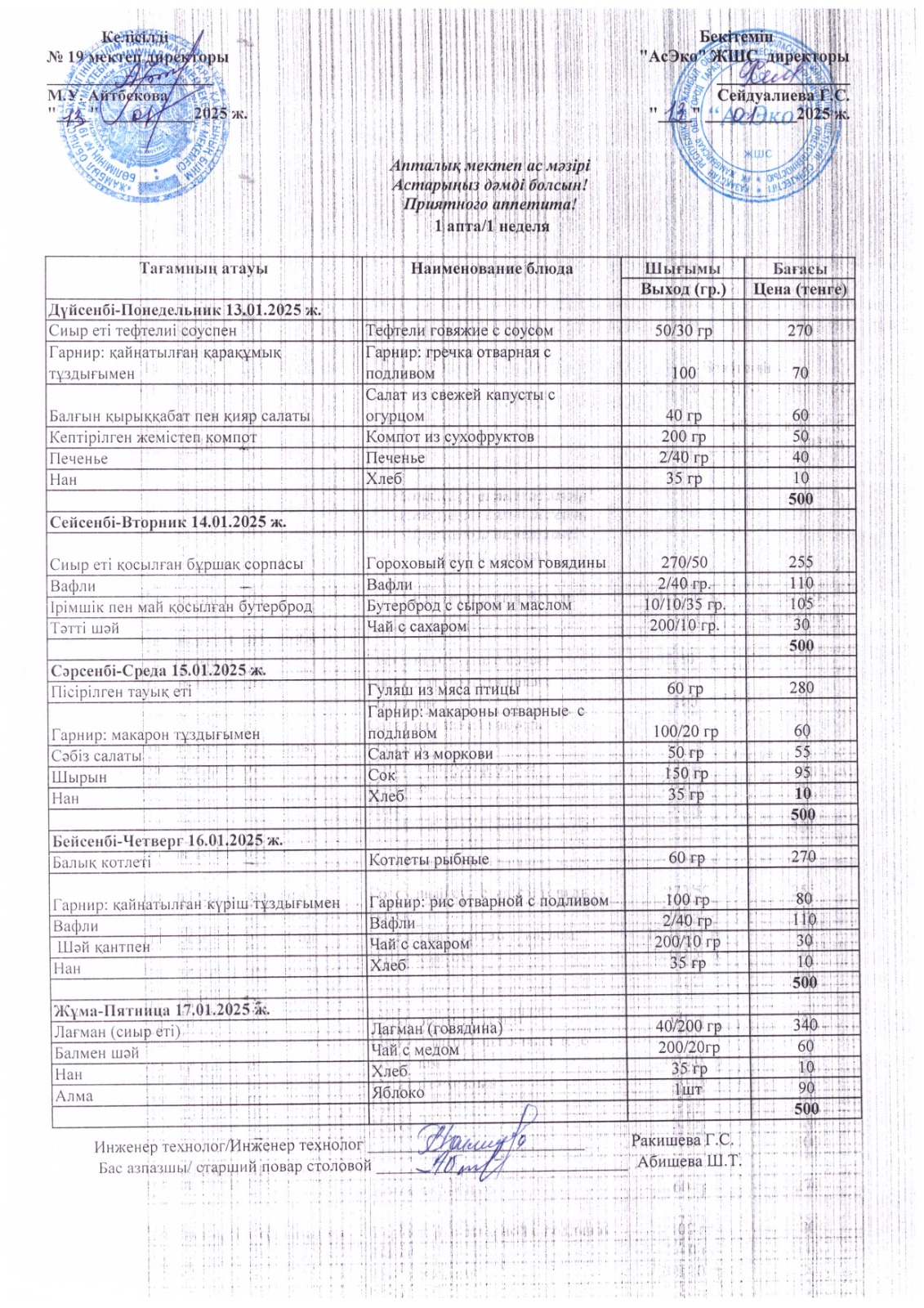 Апталық мектеп ас мәзірі (13-17..01.2025 ж.) » СШ №19