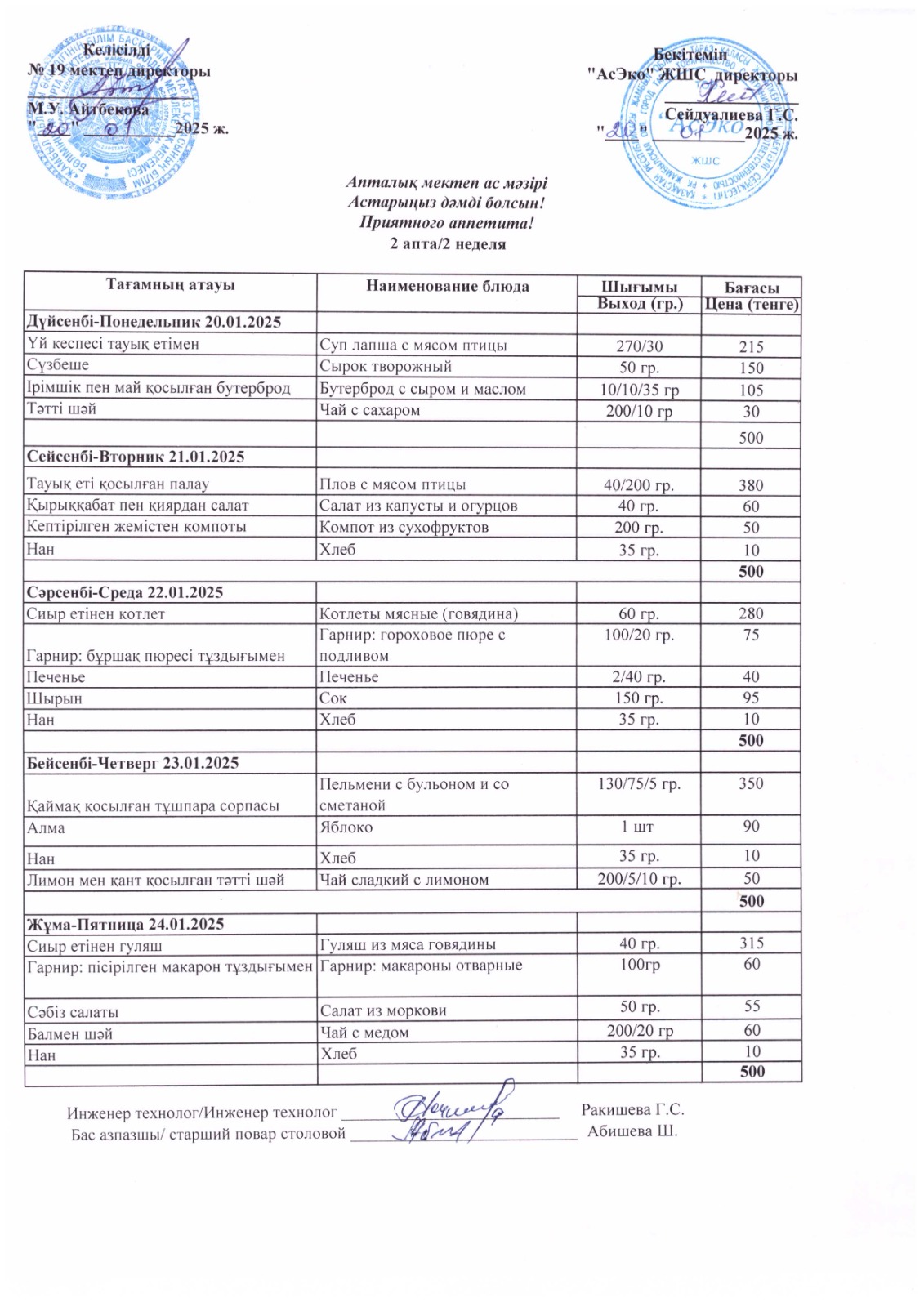 Апталық мектеп ас мәзірі (20-24..01.2025 ж.) » СШ №19