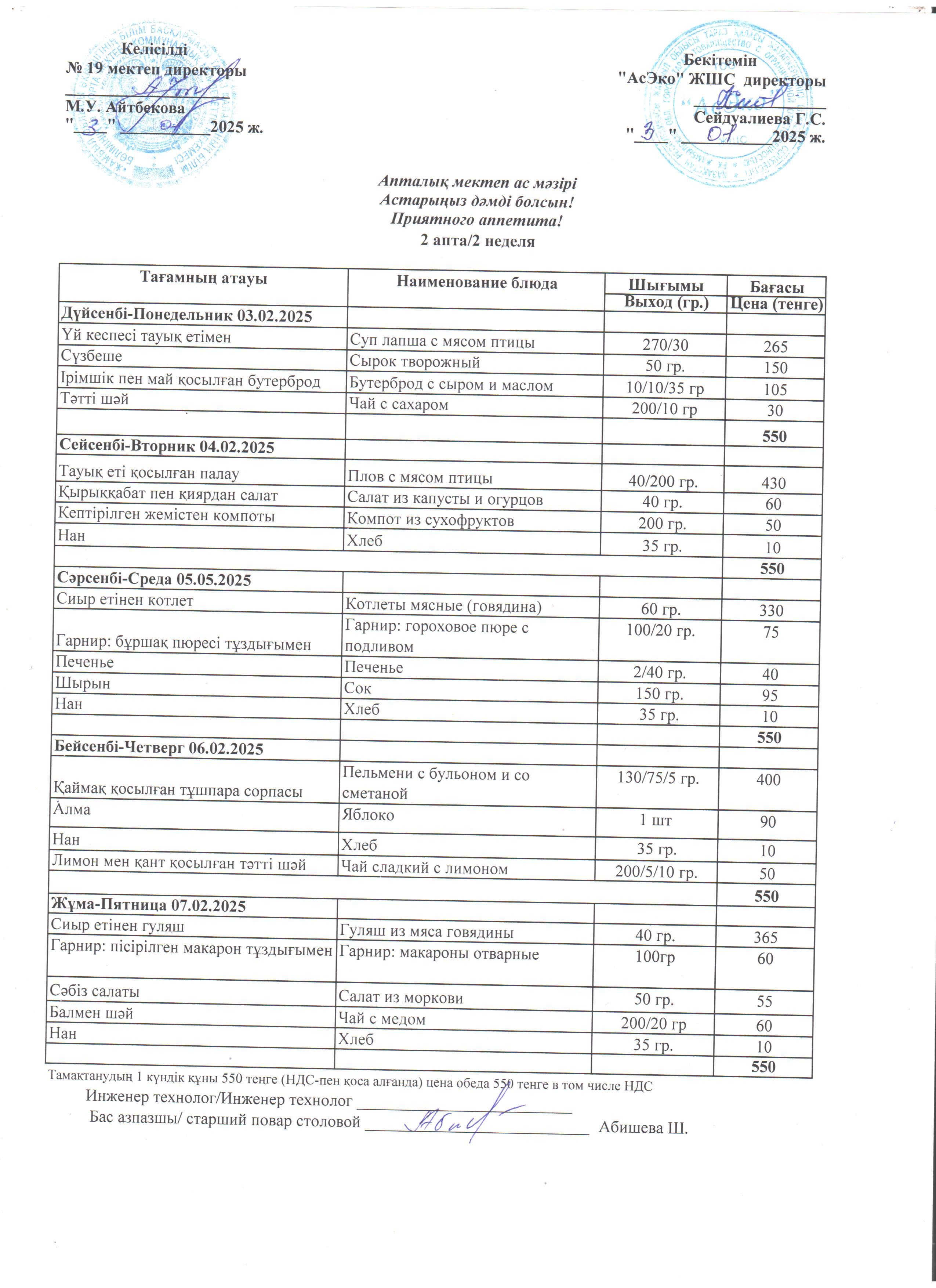 Апталық мектеп ас мәзірі (03.02-07.02.2025 ж.) » СШ №19