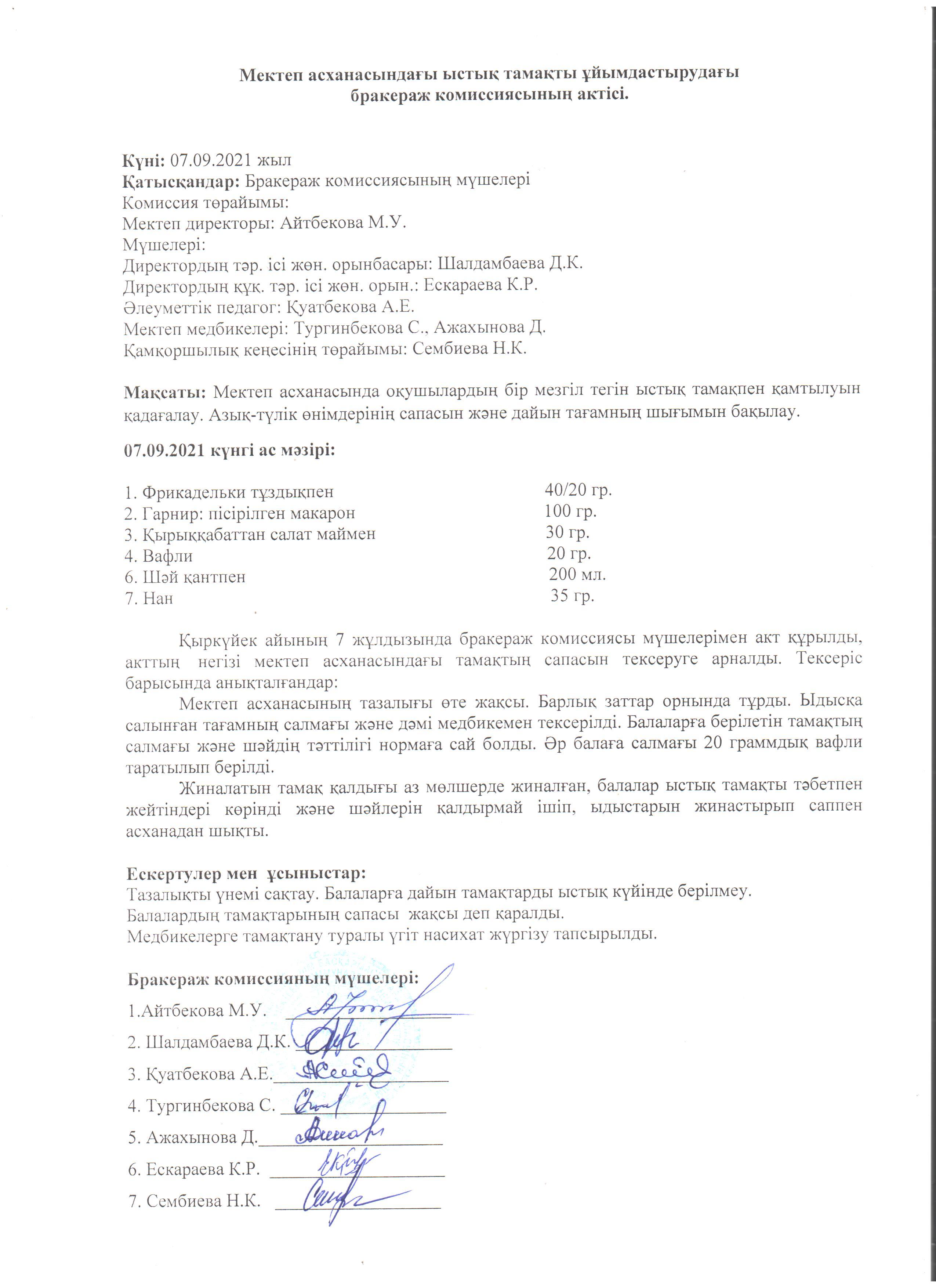 07 сентябрь 2021 0 1 2 3 4 5 Мектеп асханасындағы ыстық тамақты ұйымдастырудағы бракераж комиссияның актісі