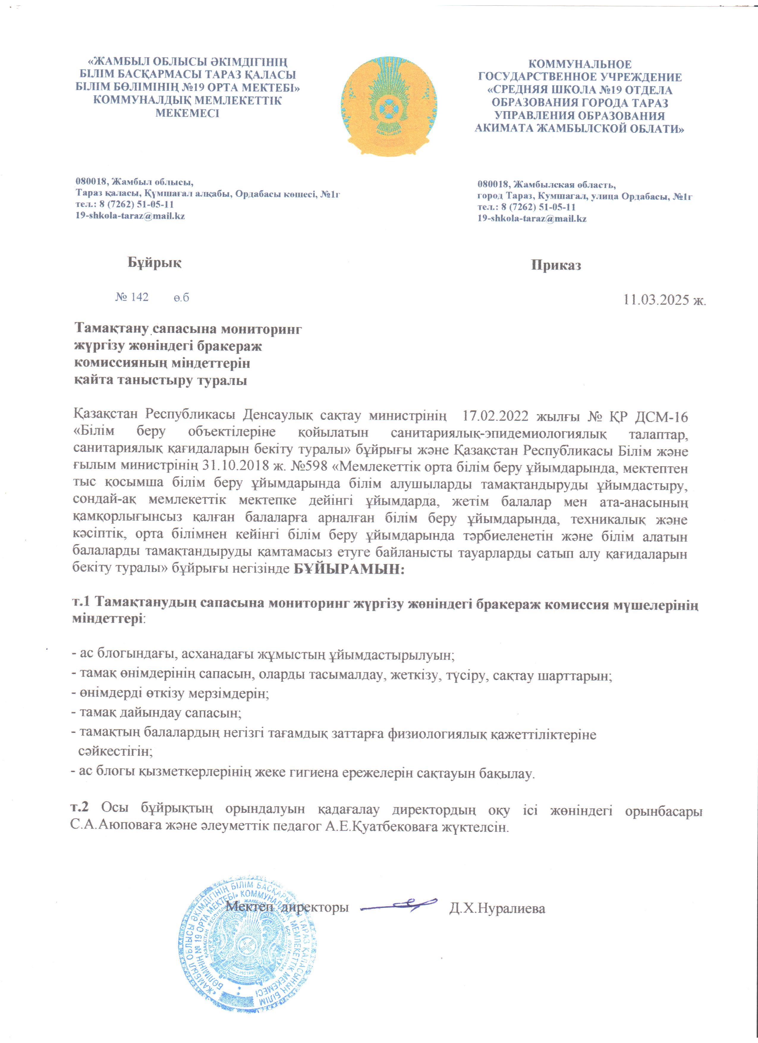11 март 2025 0 1 2 3 4 5 Тамақтану сапасына мониторинг жүргізу жөніндегі бракераж комиссияның міндеттерін қайта таныстыру туралы бұйрық №142 11.03.2025 ж.