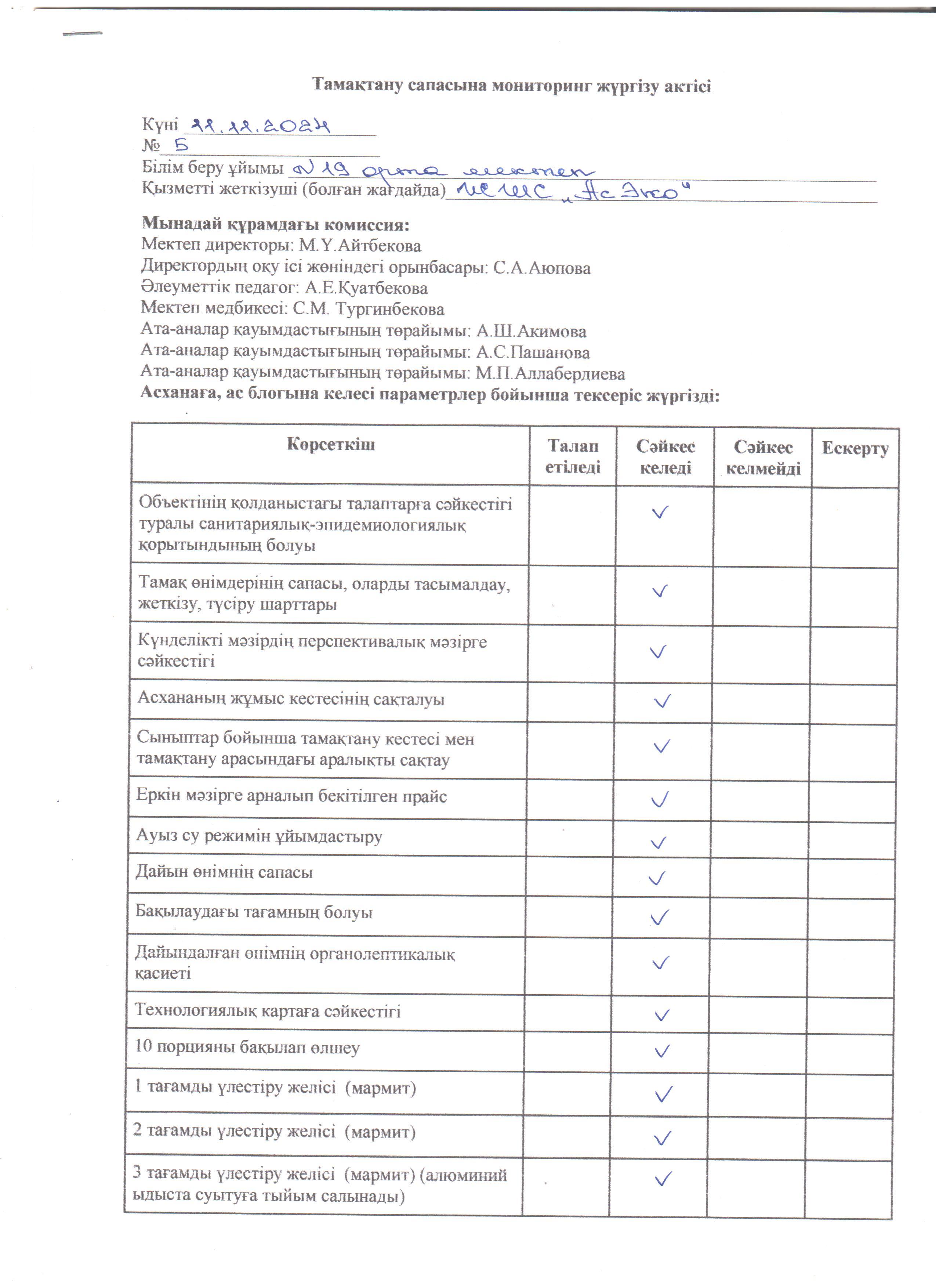 Тамақтану сапасына мониторинг жүргізу АКТ-сі №5 » СШ №19