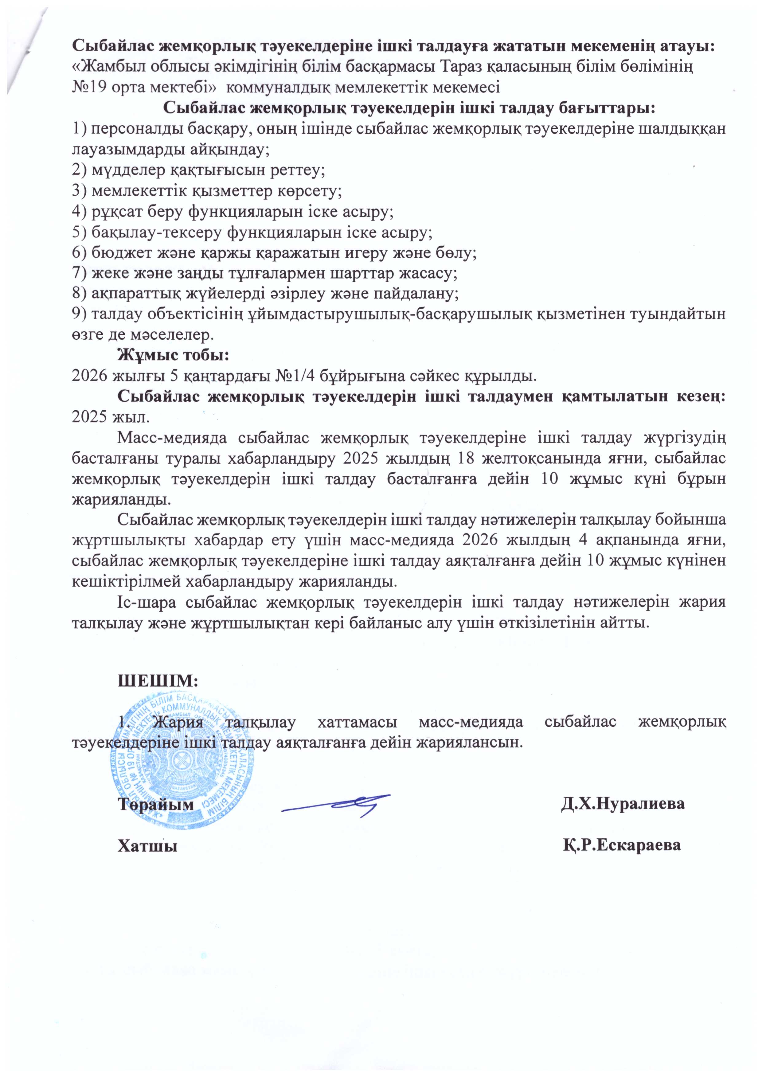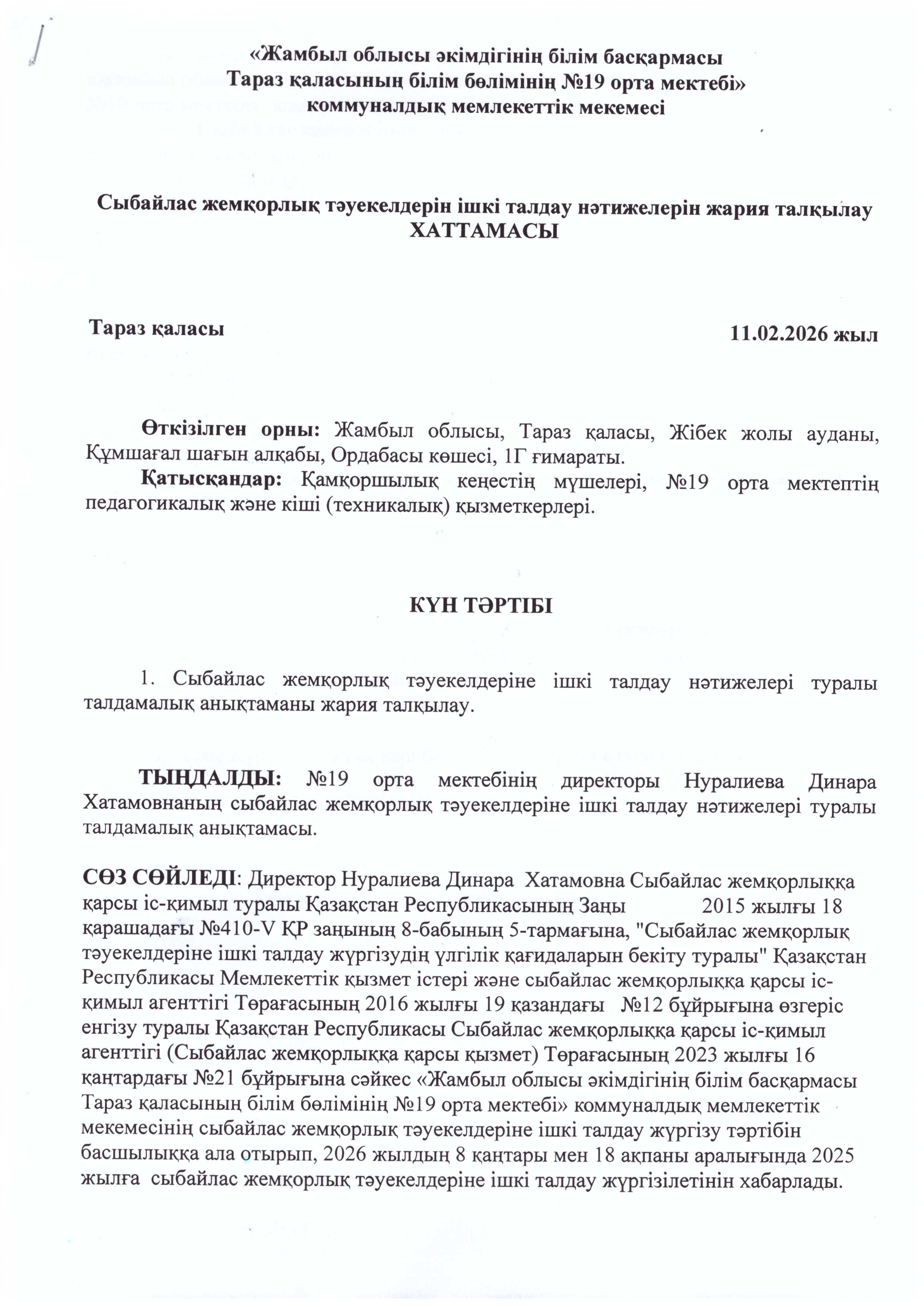 Сыбайлас жемқорлық тәуекелдерін ішкі талдау нәтижелерін жария талқылау » СШ №19