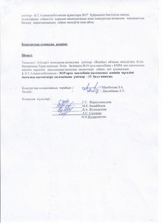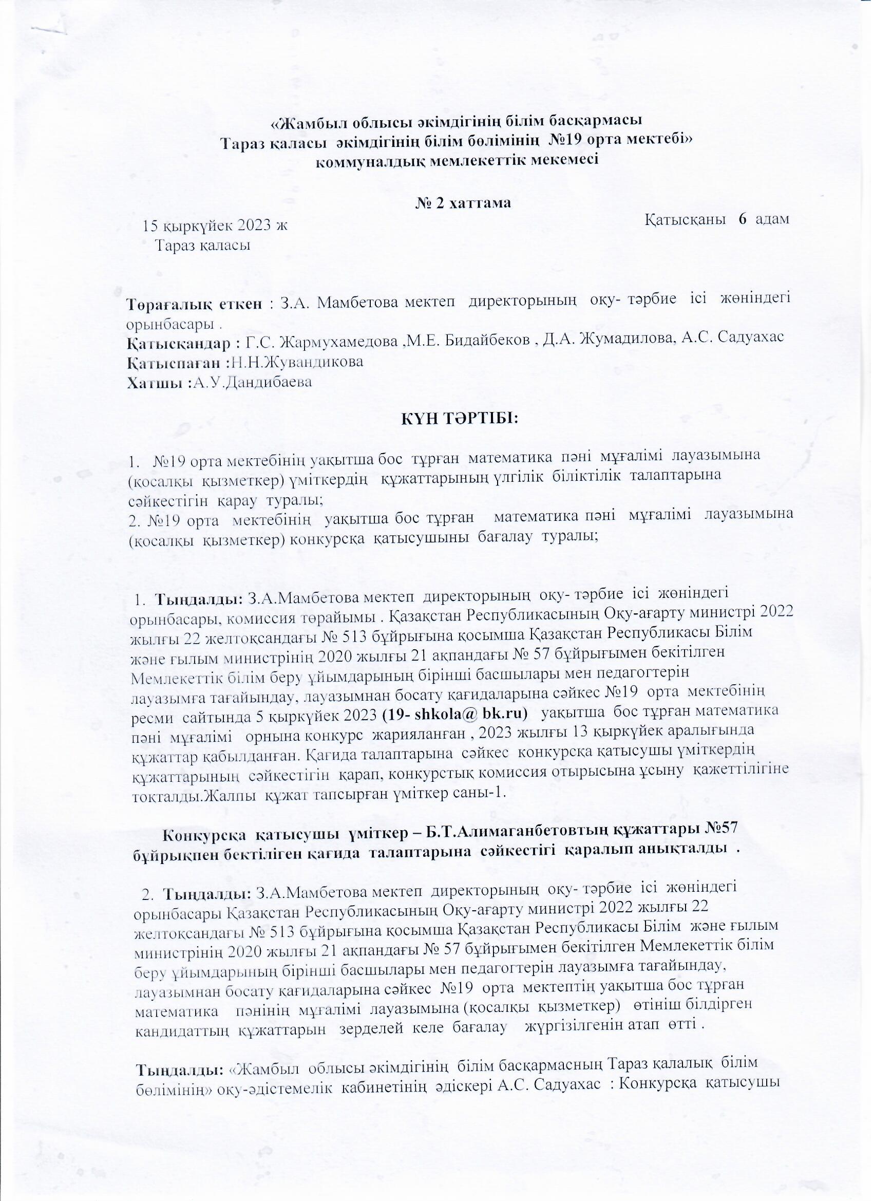 Педагог лауазымына қабылдау конкурсының хаттамасы » СШ №19