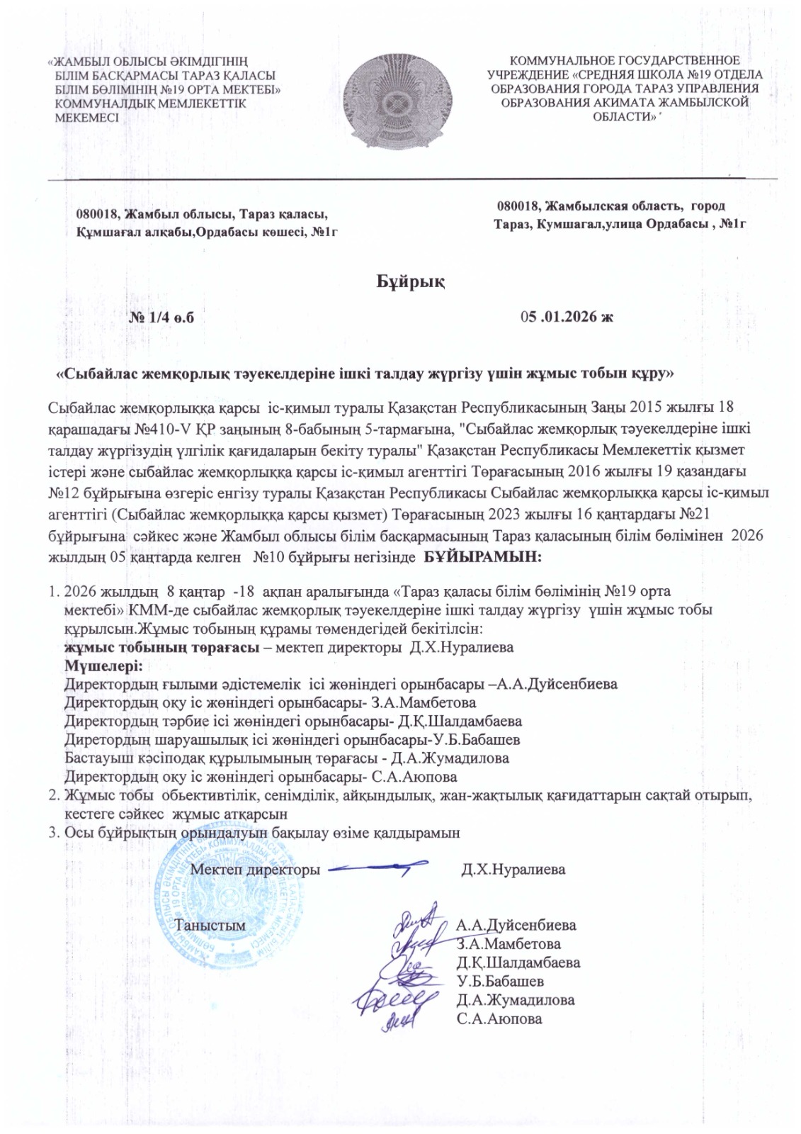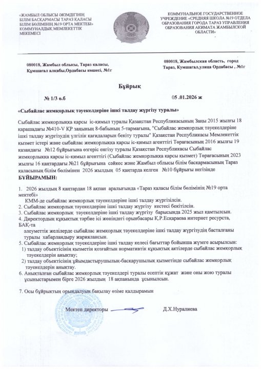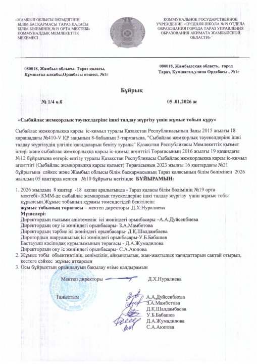 СШ №19 » Ақпарат » Сыбайлас жемқорлық тәуекелдеріне ішкі талдау жүргізу және жұмыс тобын құру туралы бұйрығы туралы»