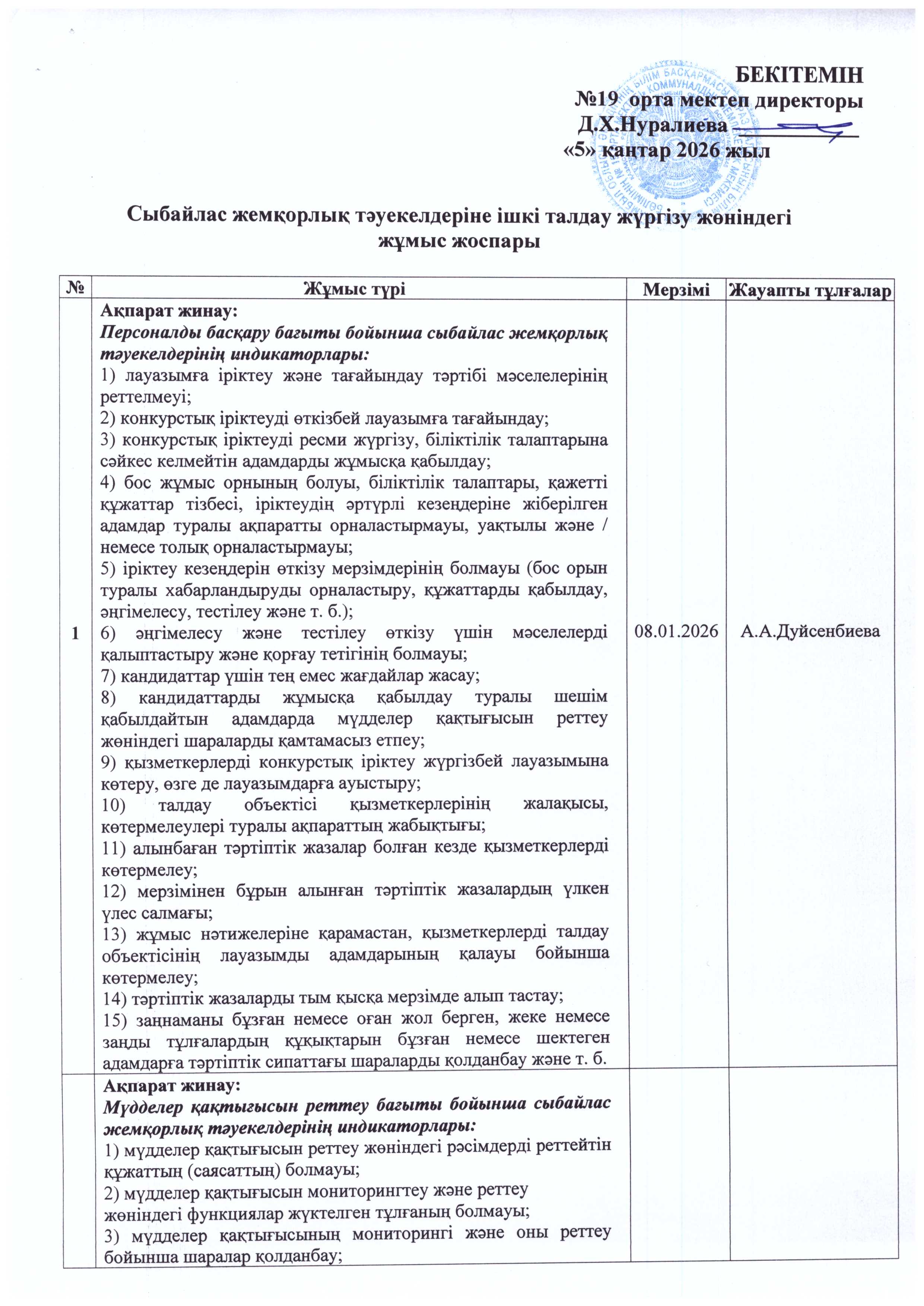 Сыбайлас жемқорлық тәуекелдеріне ішкі талдау жүргізу жөніндегі жұмыс жоспары » СШ №19