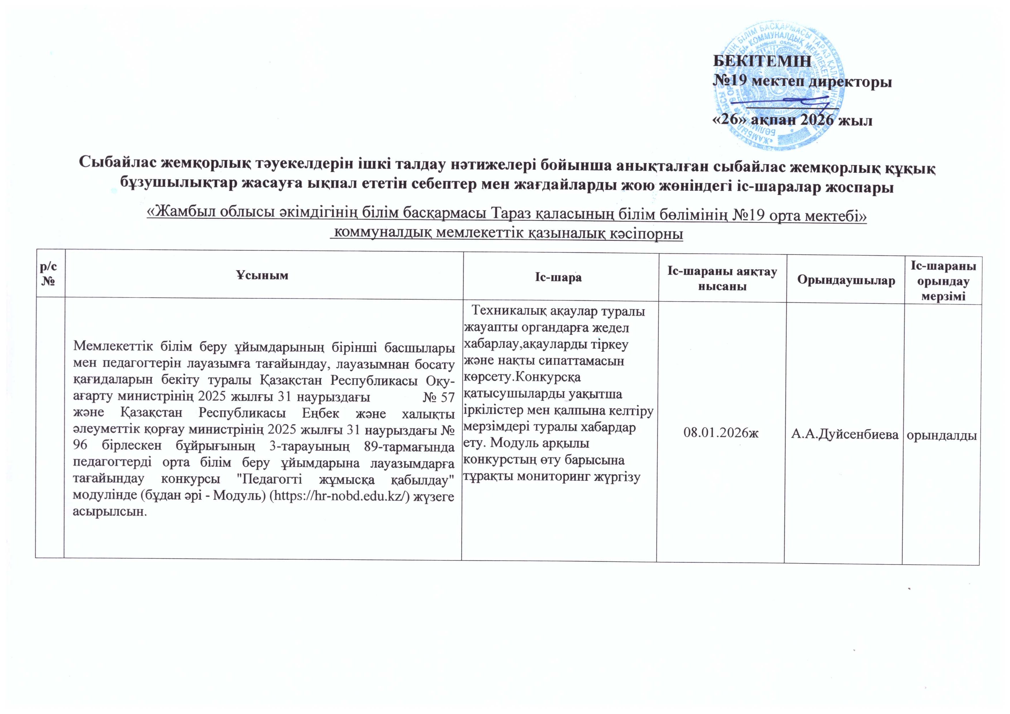 Сыбайлас жемқорлық тәуекелдеріне ішкі талдау нәтижелері бойынша анықталған сыбайлас жемқорлық құқық бұзушылықтар жасауға ықпал ететін себептер мен жағдайларды жою жөніндегі іс-шаралар жоспары » СШ №19