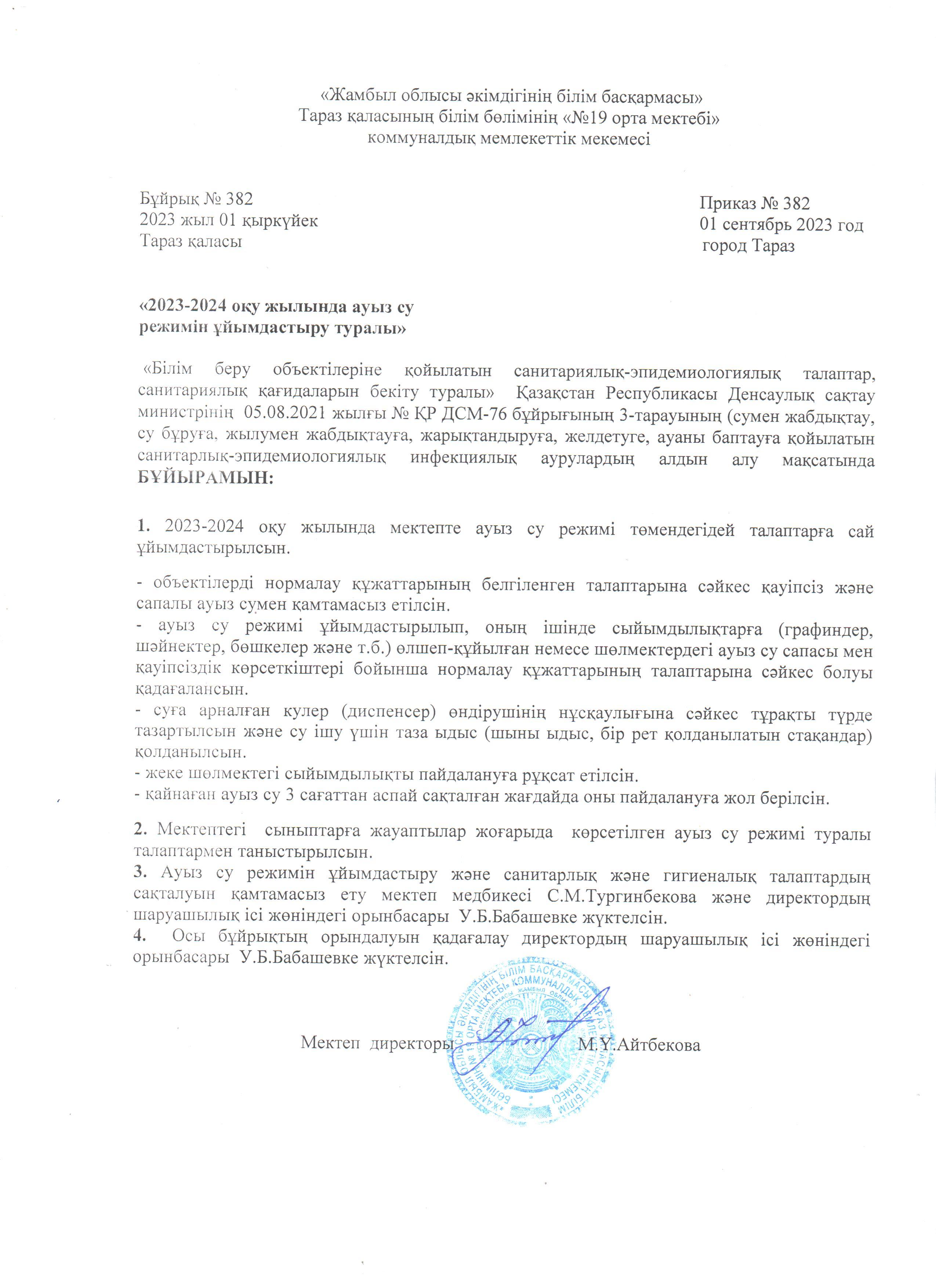 01 сентябрь 2023 0 1 2 3 4 5 2023-2024 оқу жылында ауыз су режимін ұйымдастыру туралы бұйрық №382 01.09.2023 ж.