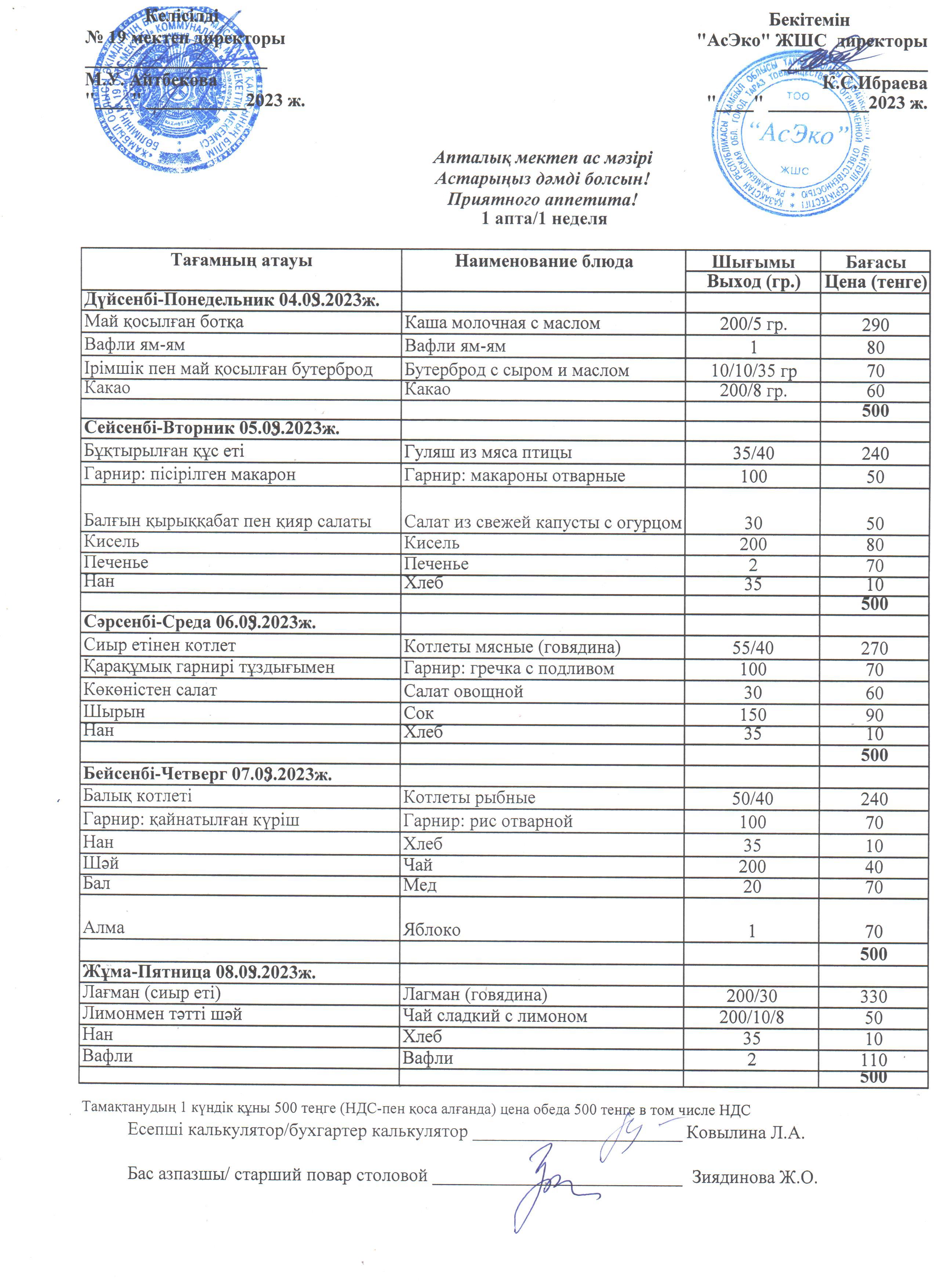 Апталық мектеп ас мәзірі 04.09.2023-08.09.2023 ж. » СШ №19
