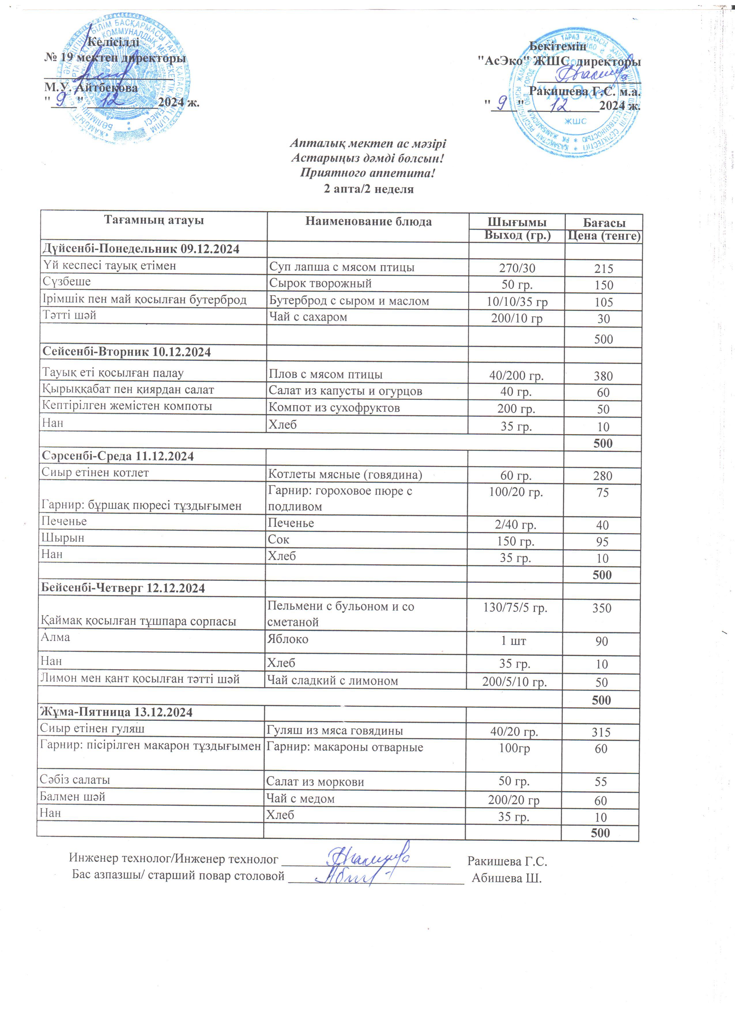 Апталық мектеп ас мәзірі (9.12-13.12.2024 ж.) » СШ №19