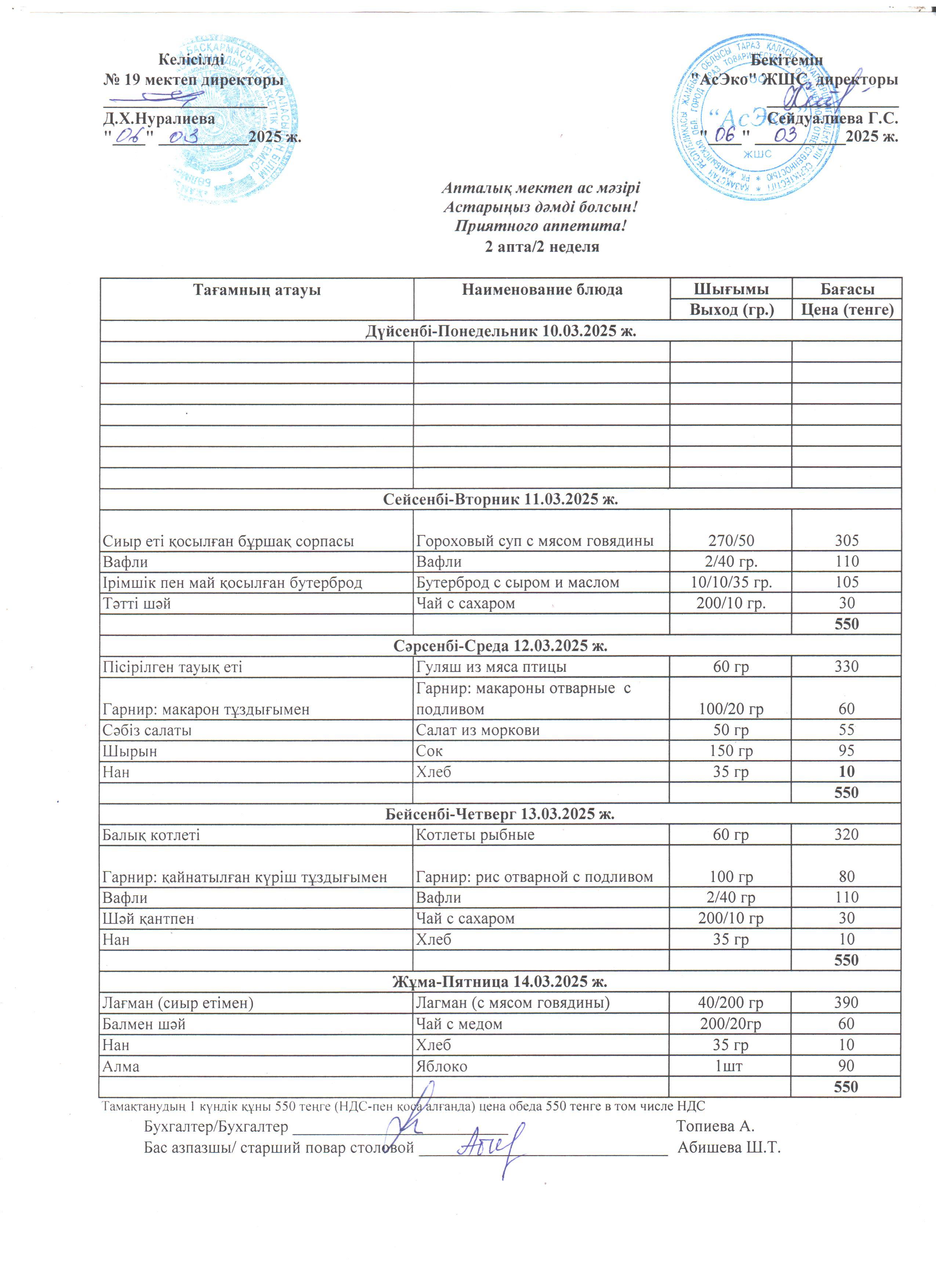 Апталық мектеп ас мәзірі (11.03-14.03.2025 ж.)