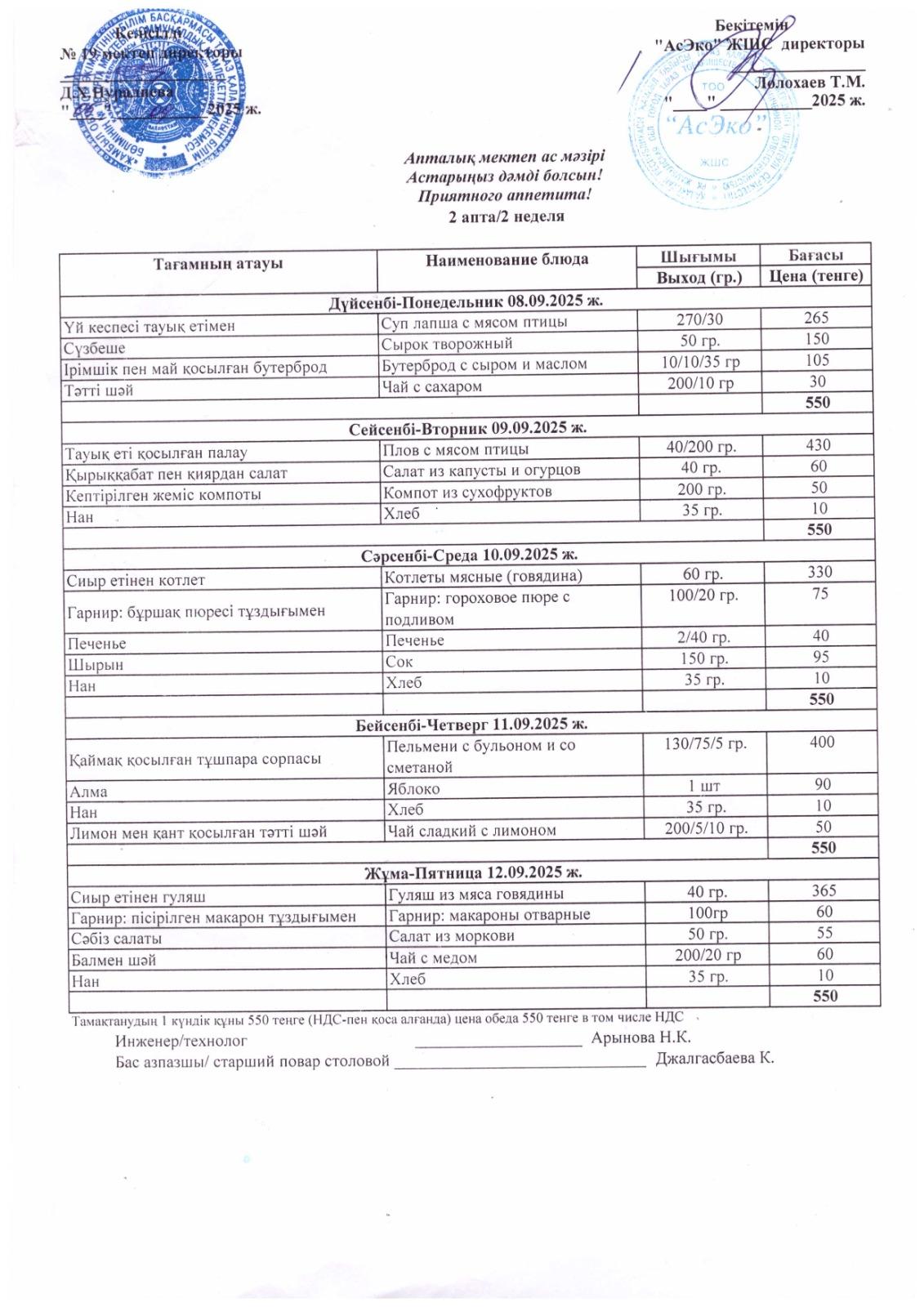 Апталық мектеп ас мәзірі (08.09- 12.09) 2025ж » СШ №19
