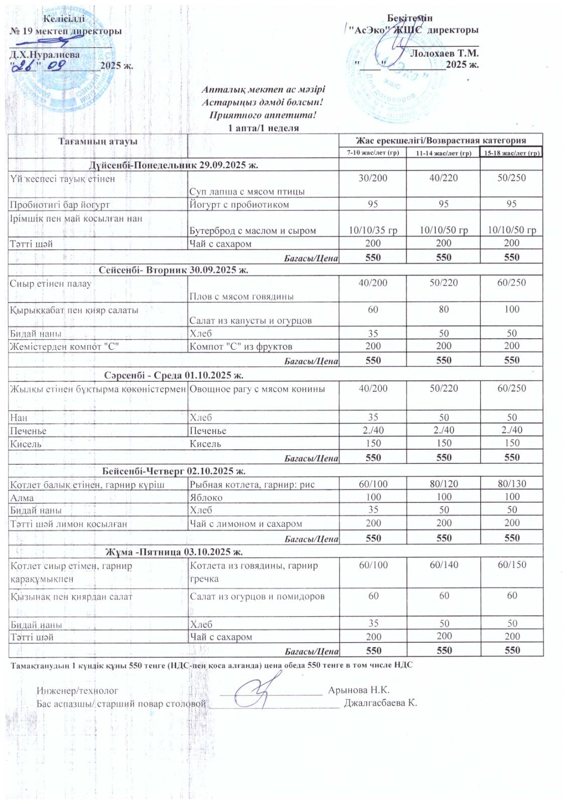 Апталық мектеп ас мәзірі (29.09- 03.10) 2025ж