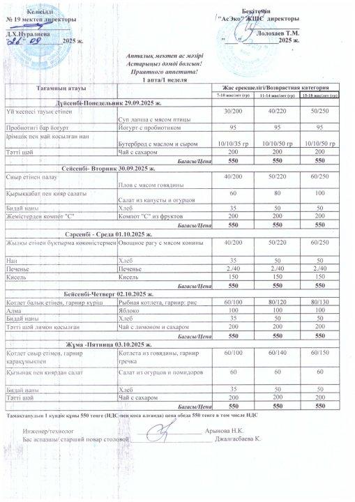 Апталық мектеп ас мәзірі (29.09- 03.10) 2025ж » СШ №19