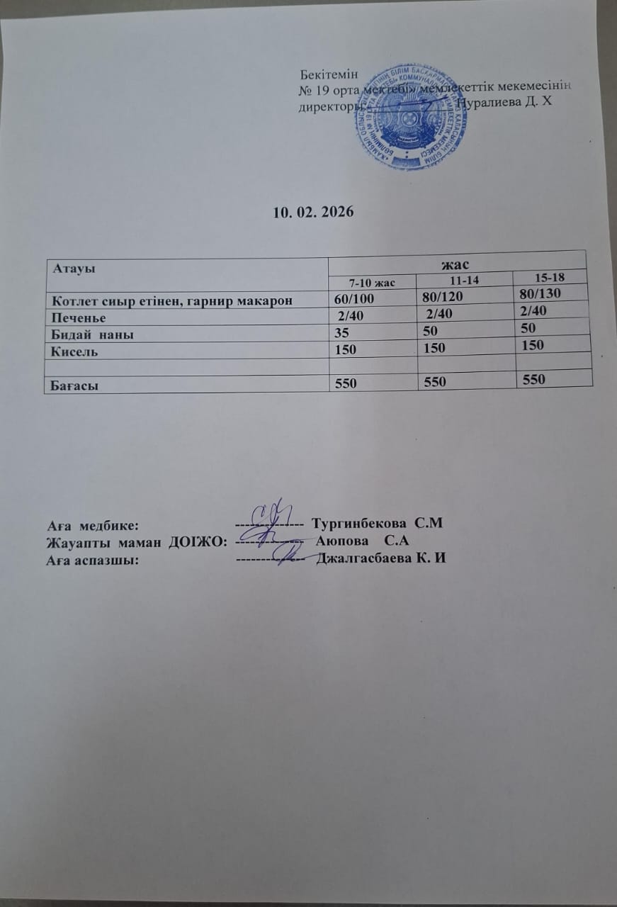 Күндік ас мәзірі » СШ №19