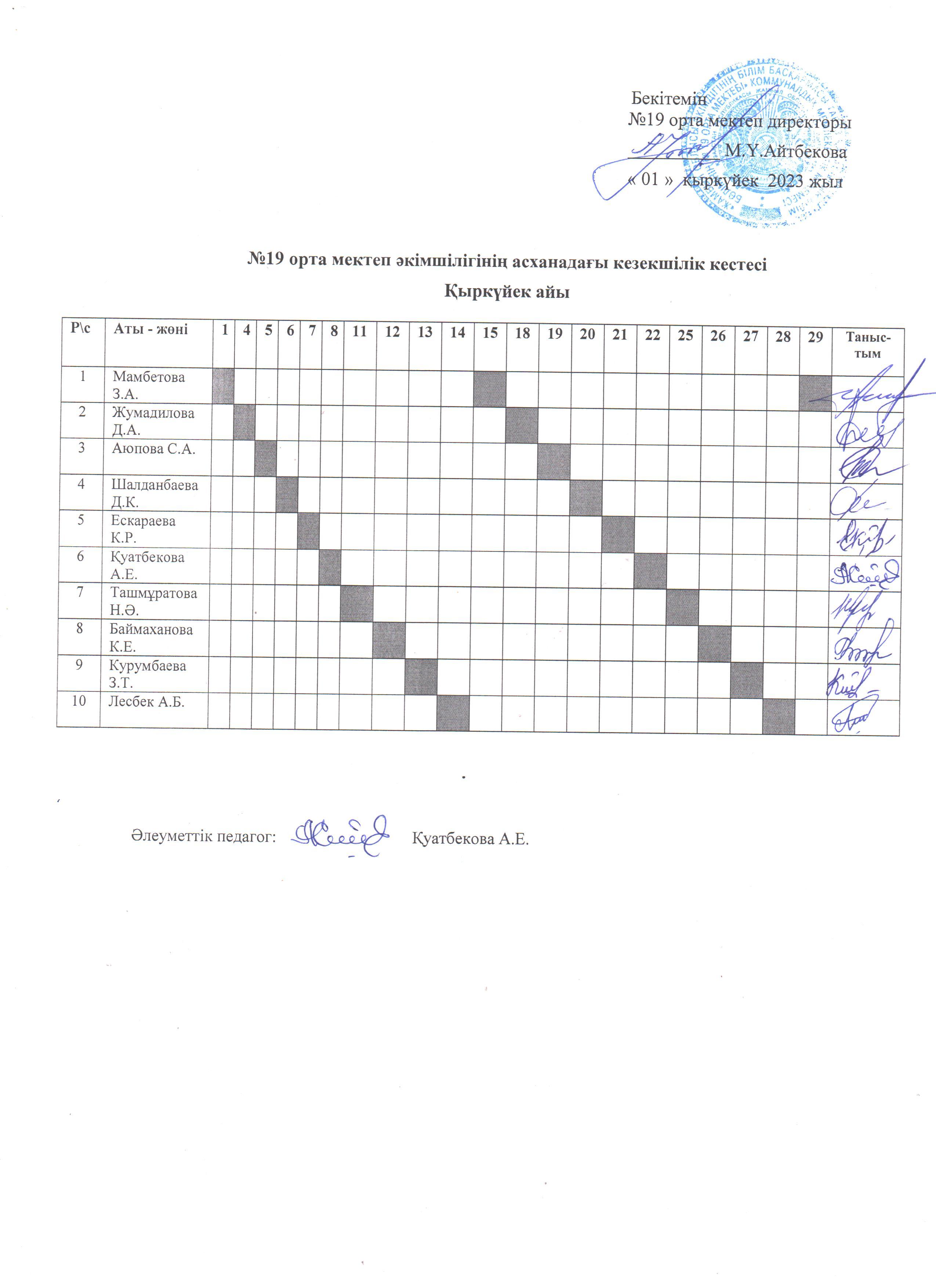 №19 орта мектеп әкімшілігінің асханадағы кезекшілік кестесі