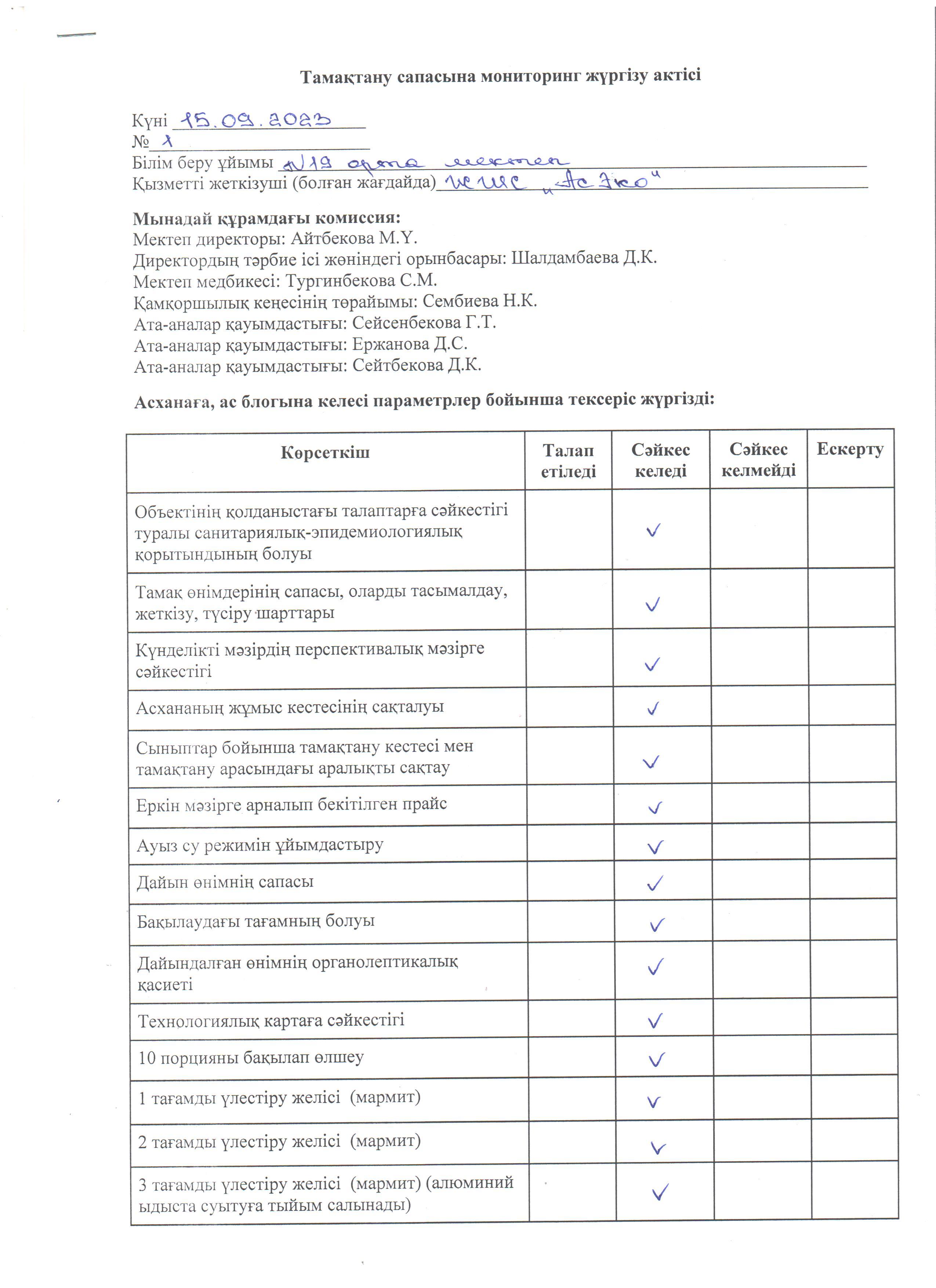 Тамақтану сапасына мониторинг жүргізу актісі №1 » СШ №19